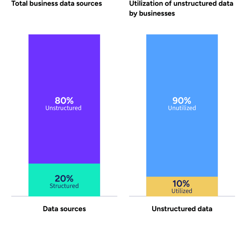 Sin embargo, este valor permanece en gran medida sin explotar. Las investigaciones indican que, aunque más del 80 % de las fuentes de datos son no estructuradas, menos del 10 % de esta información se utiliza de forma efectiva en procesos empresariales o en la toma de decisiones.